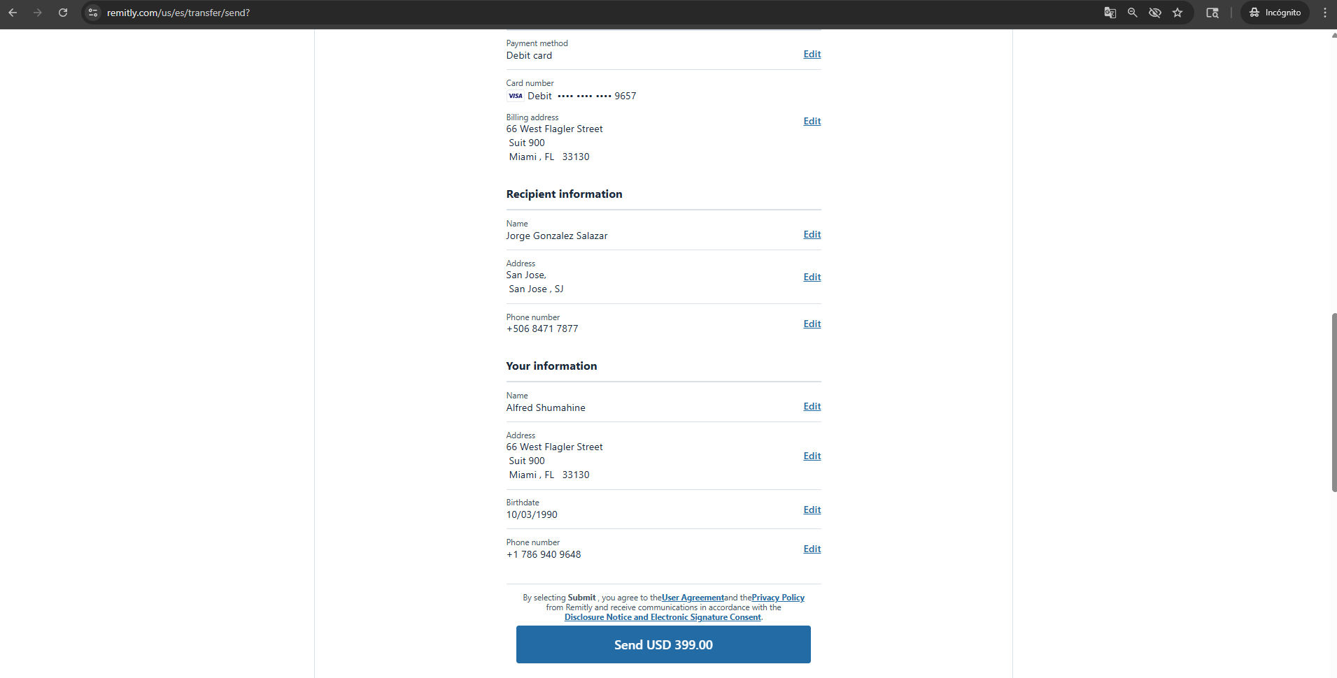 Enter the Receiver’s information: name, amount, address, and phone number.