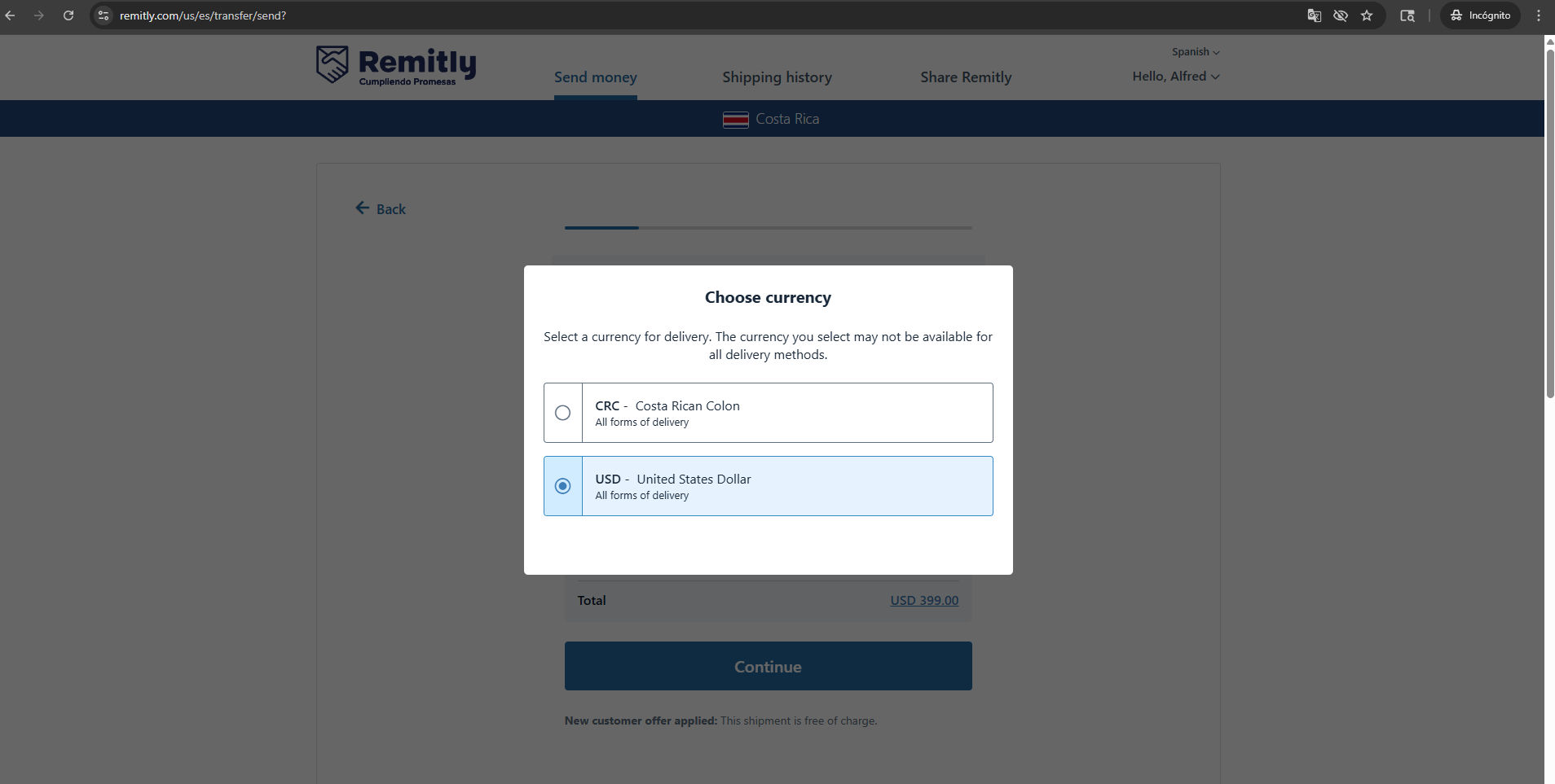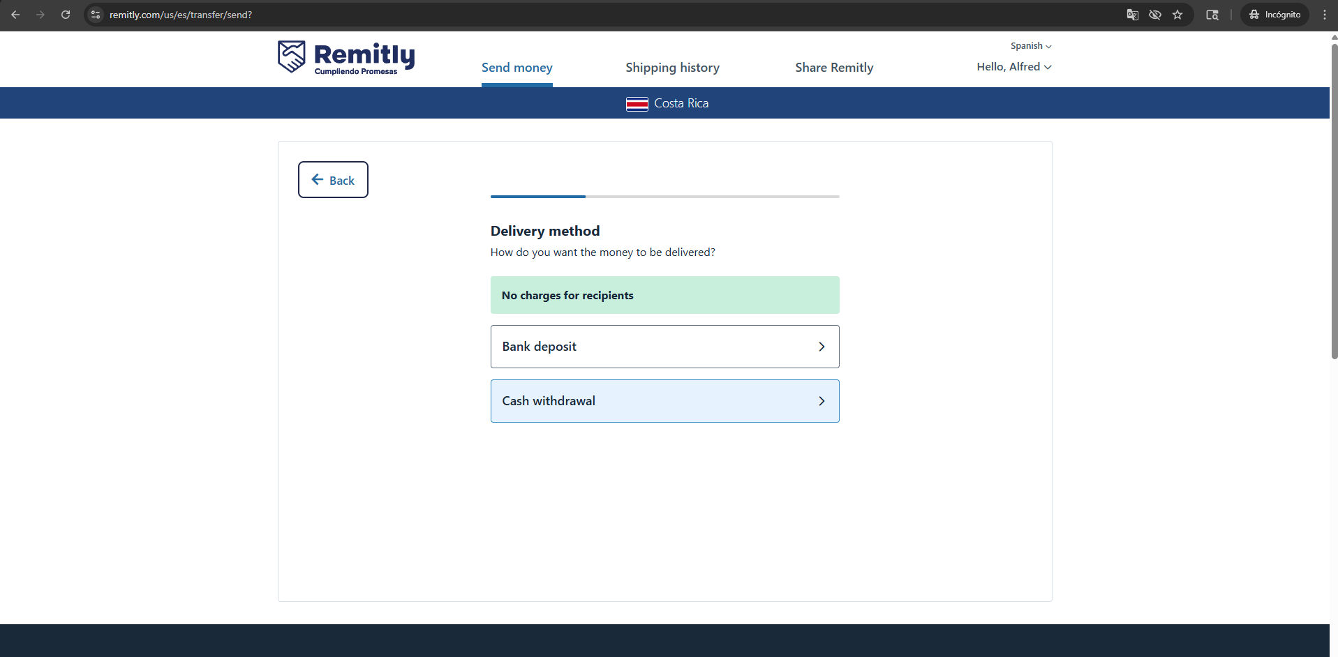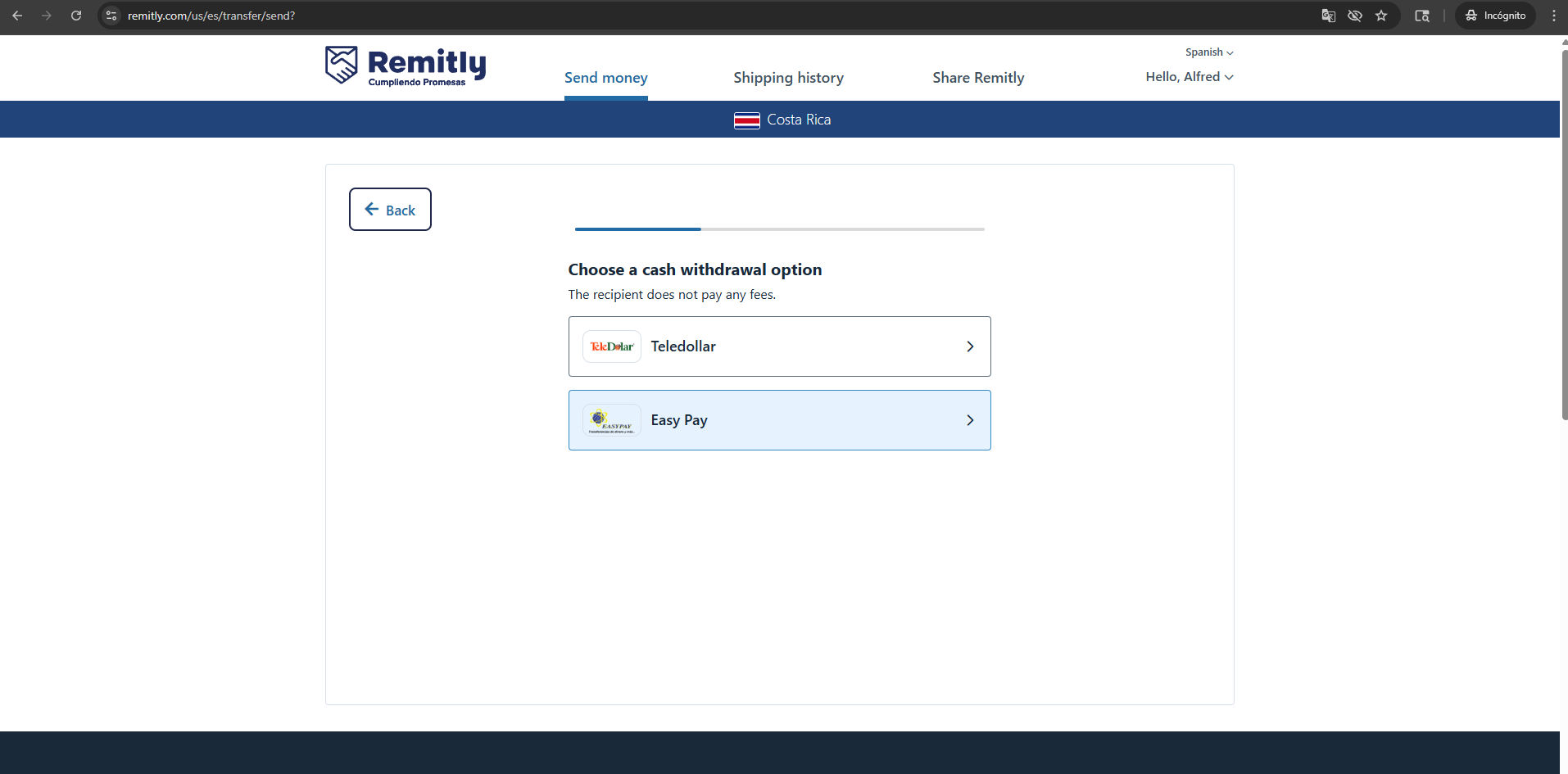 Select the transfer service you want to use: MoneyGram, Remitly, Boss Revolution, or Intermex.